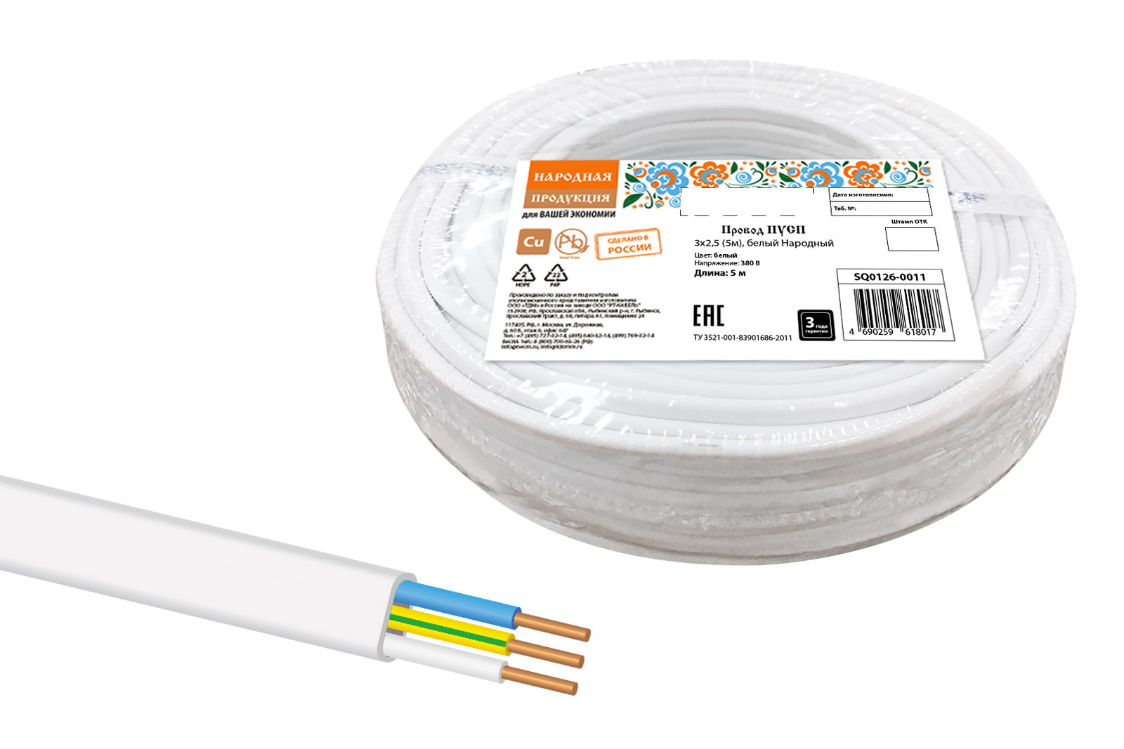 Провод ПУСП 3х2,5 (5м), белый Народный