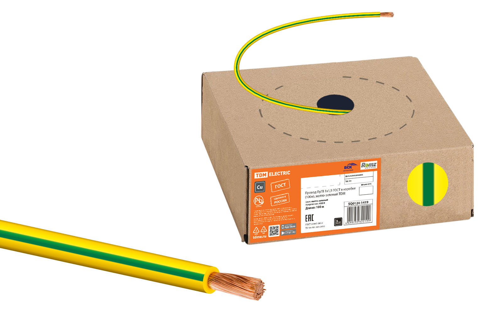 Наименование: Провод ПуГВ 1х1,5 ГОСТ в коробке (100м), желто-зеленый TDM
