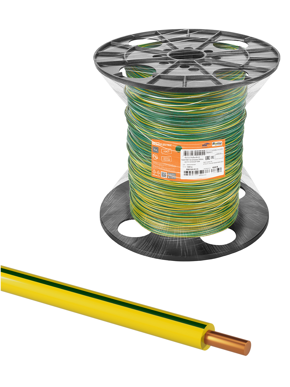 Наименование: Провод ПуВнг(А)-LS 1х2,5 ГОСТ на катушке (500м), желто-зеленый TDM