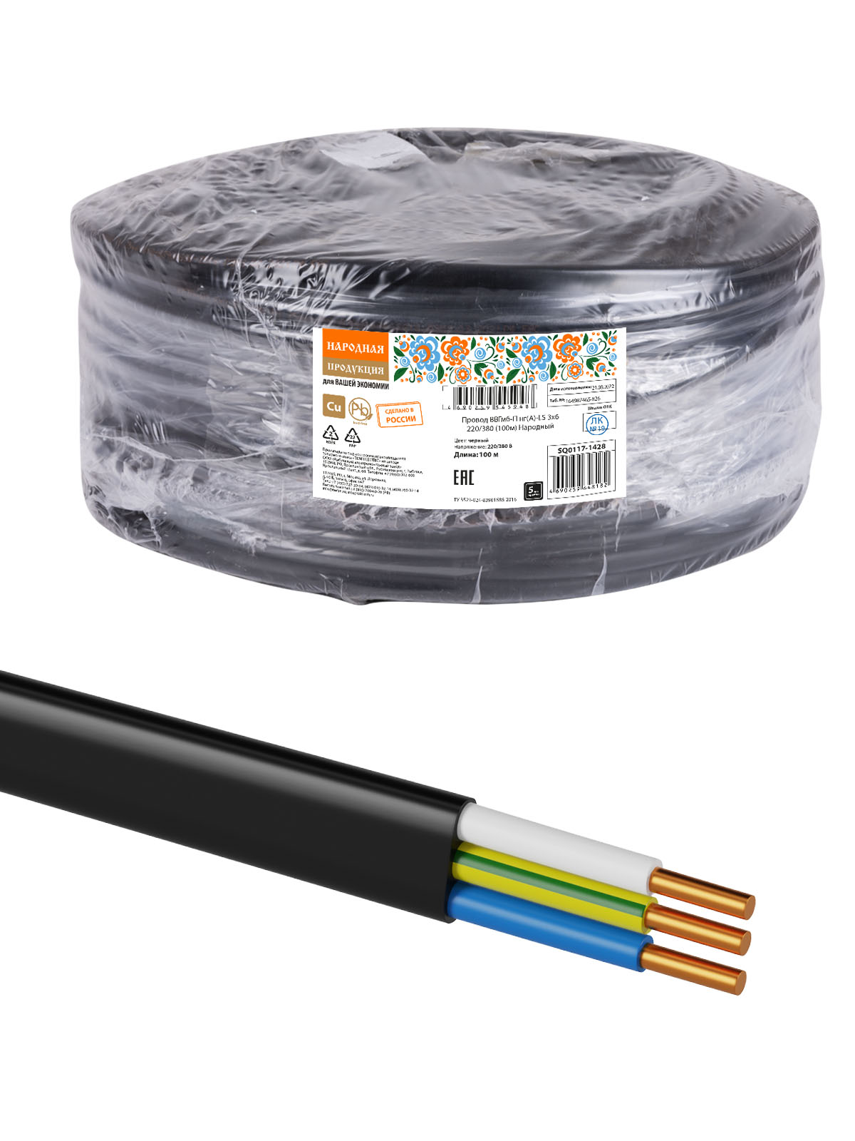 Наименование: Провод ВВГмб-П нг(А)-LS 3х6 220/380 (100м) Народный