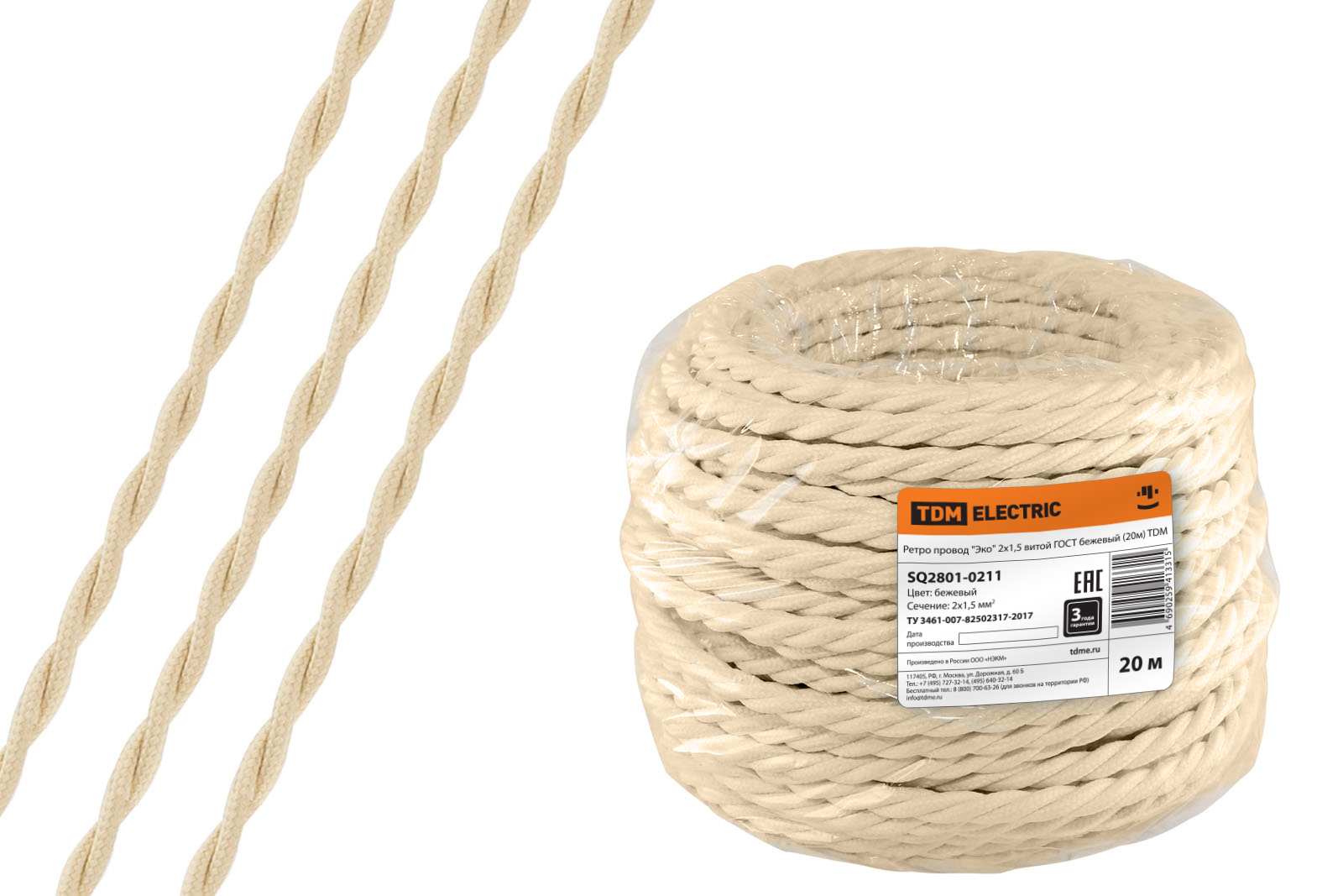 Наименование: Ретро провод "Эко" 2х1,5 витой ГОСТ бежевый (20м) TDM