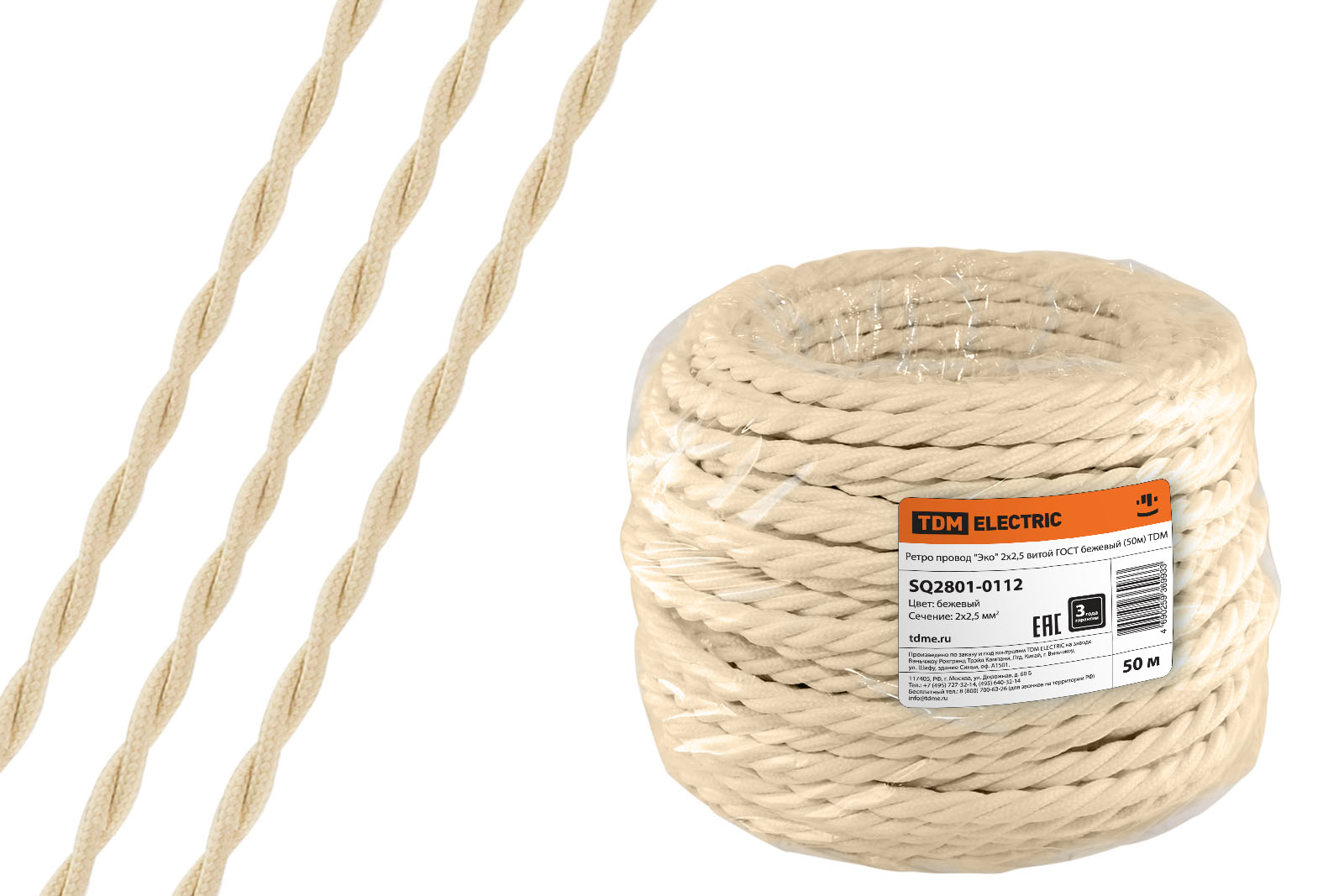 Наименование: Ретро провод "Эко" 2х2,5 витой ГОСТ бежевый (50м) TDM