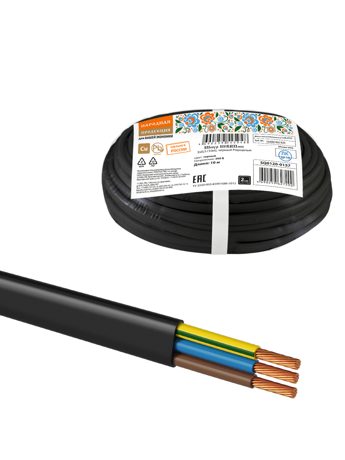Наименование: Шнур ШВВПмб 3х0,5 (10м), черный Народный