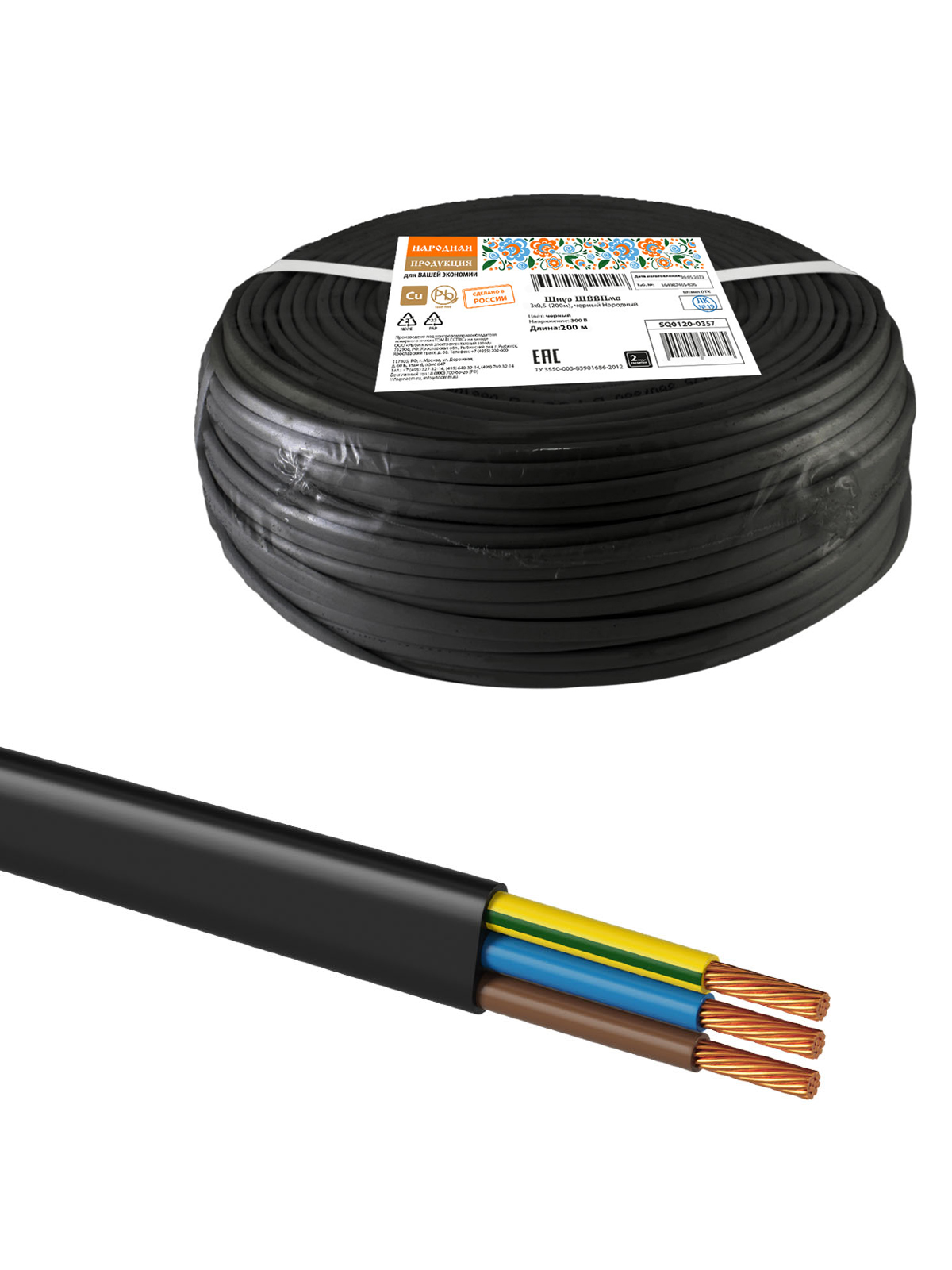Наименование: Шнур ШВВПмб 3х0,5 (200м), черный Народный