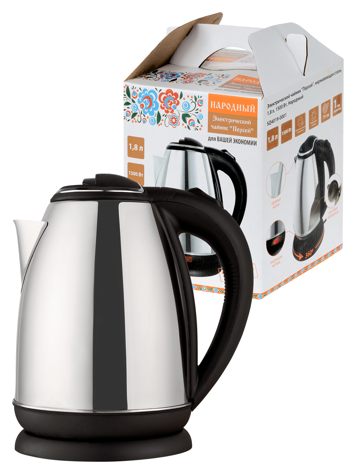 Наименование: Электрический чайник "Персей", нержавеющая сталь, 1,8 л, 1500 Вт, Народный