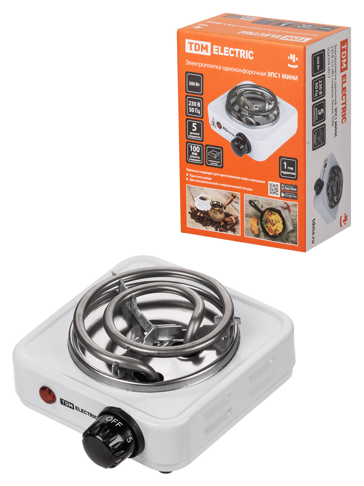 Наименование: Электроплитка одноконф. ЭПС1 МИНИ, 230 В, 0,5 кВт, спираль, белая, TDM