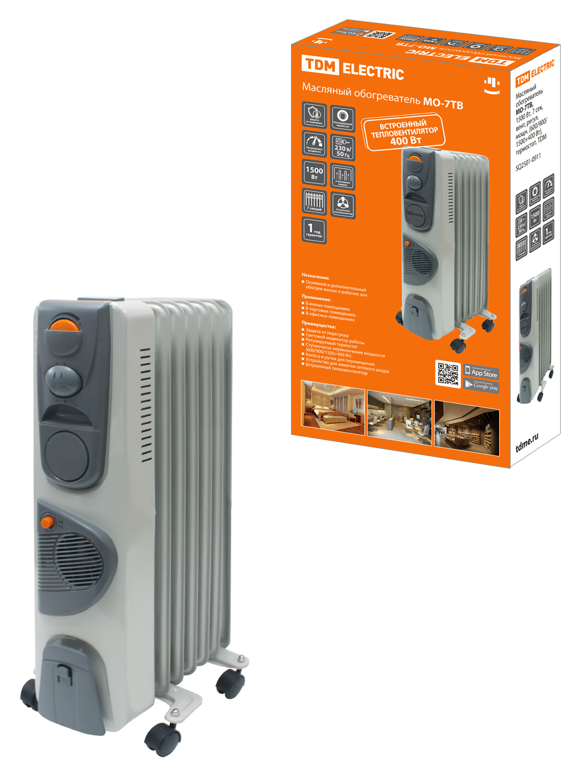 Наименование: Масл. обогрев. МО-7ТВ, 1500 Вт, 7 сек, вент, регул. мощн. (600/900/1500+400 Вт), термостат, TDM