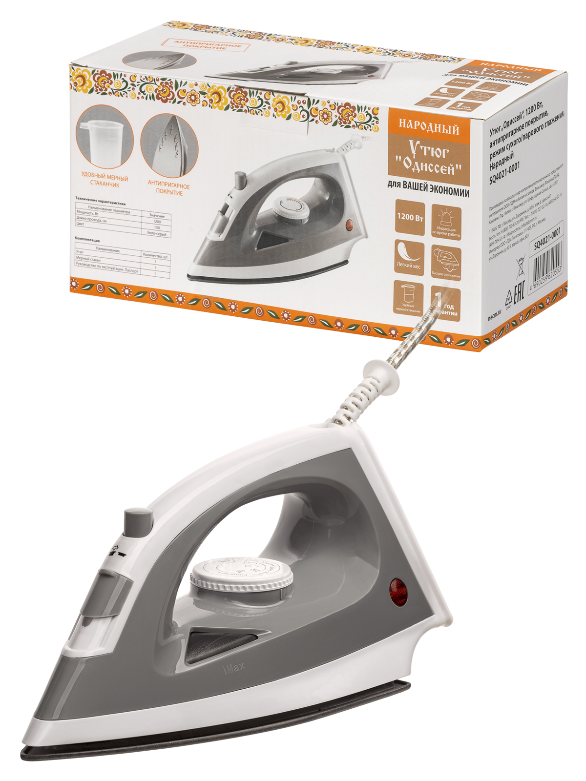 Наименование: Утюг "Одиссей", 1200 Вт, антипригарное покрытие, режим сухого/парового глажения, Народный