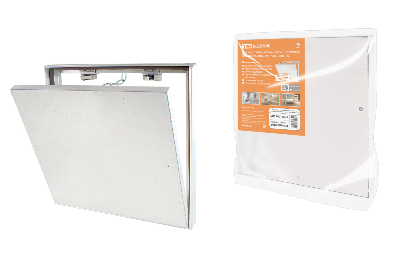 Наименование: Люк под плитку, алюминиевый, съемный, нажимной, ограничитель-цепочка, 200х300, TDM