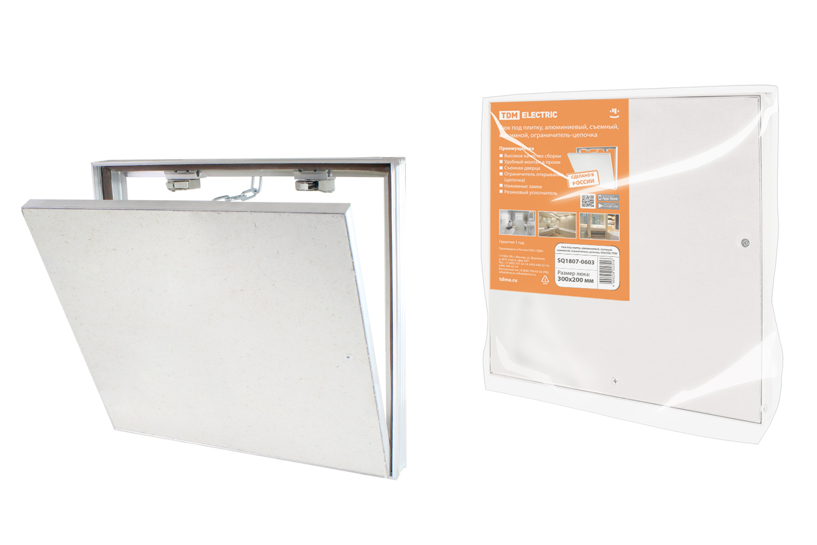 Наименование: Люк под плитку, алюминиевый, съемный, нажимной, ограничитель-цепочка, 300х200, TDM