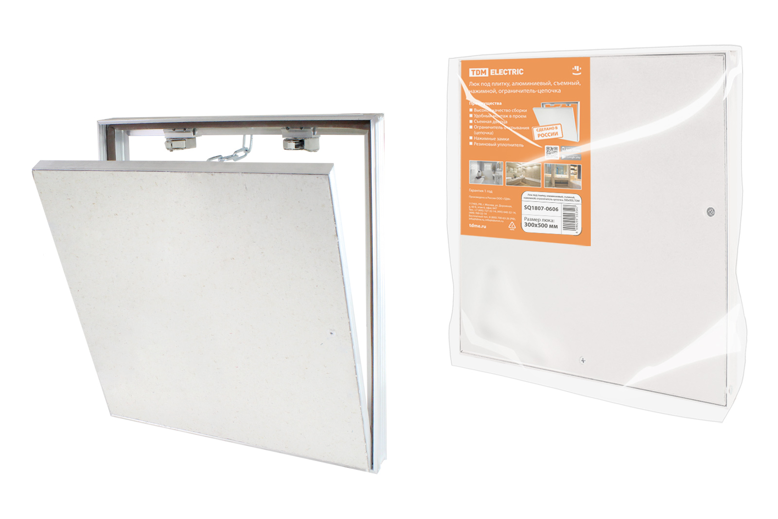 Наименование: Люк под плитку, алюминиевый, съемный, нажимной, ограничитель-цепочка, 300х500, TDM