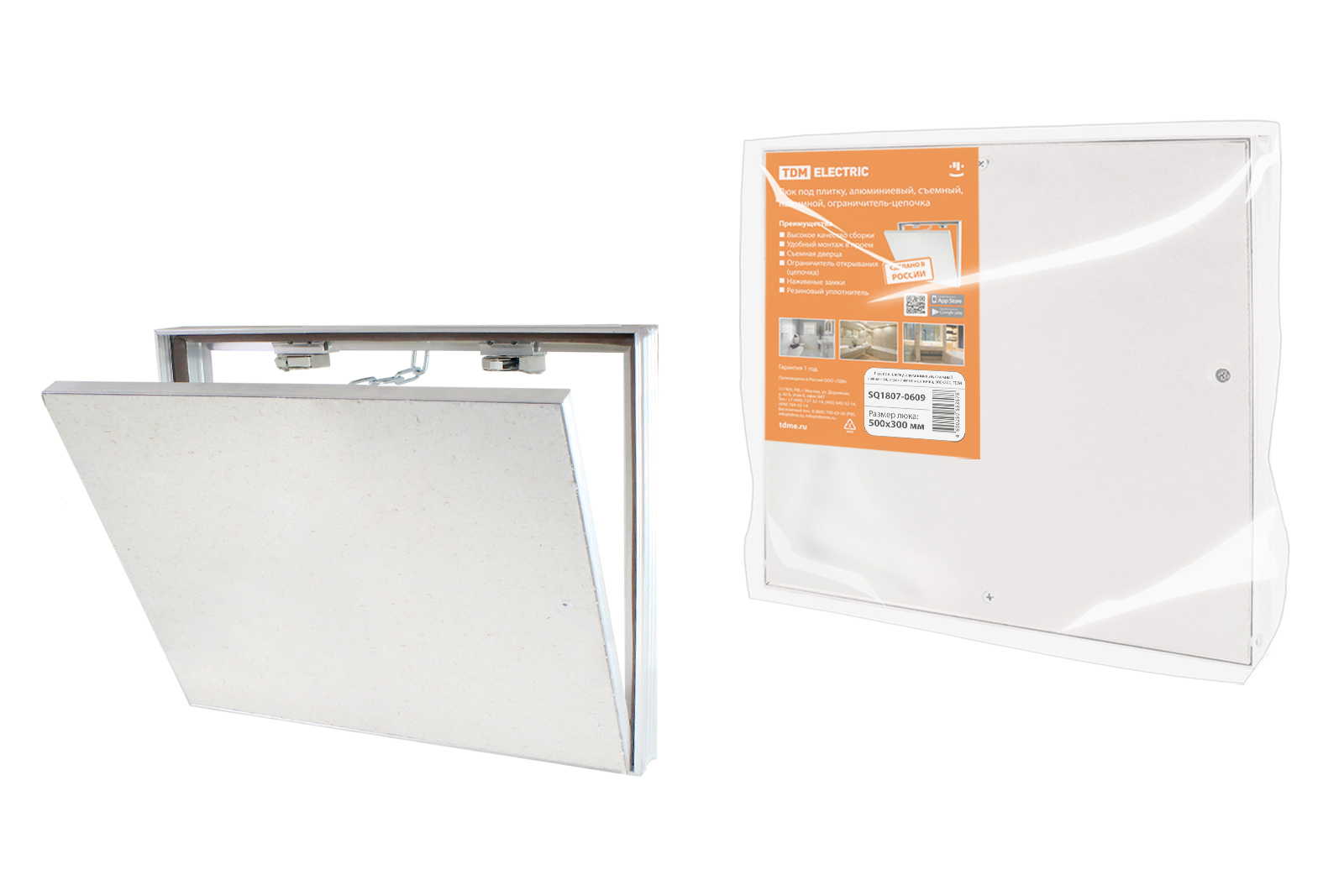 Наименование: Люк под плитку, алюминиевый, съемный, нажимной, ограничитель-цепочка, 500х300, TDM