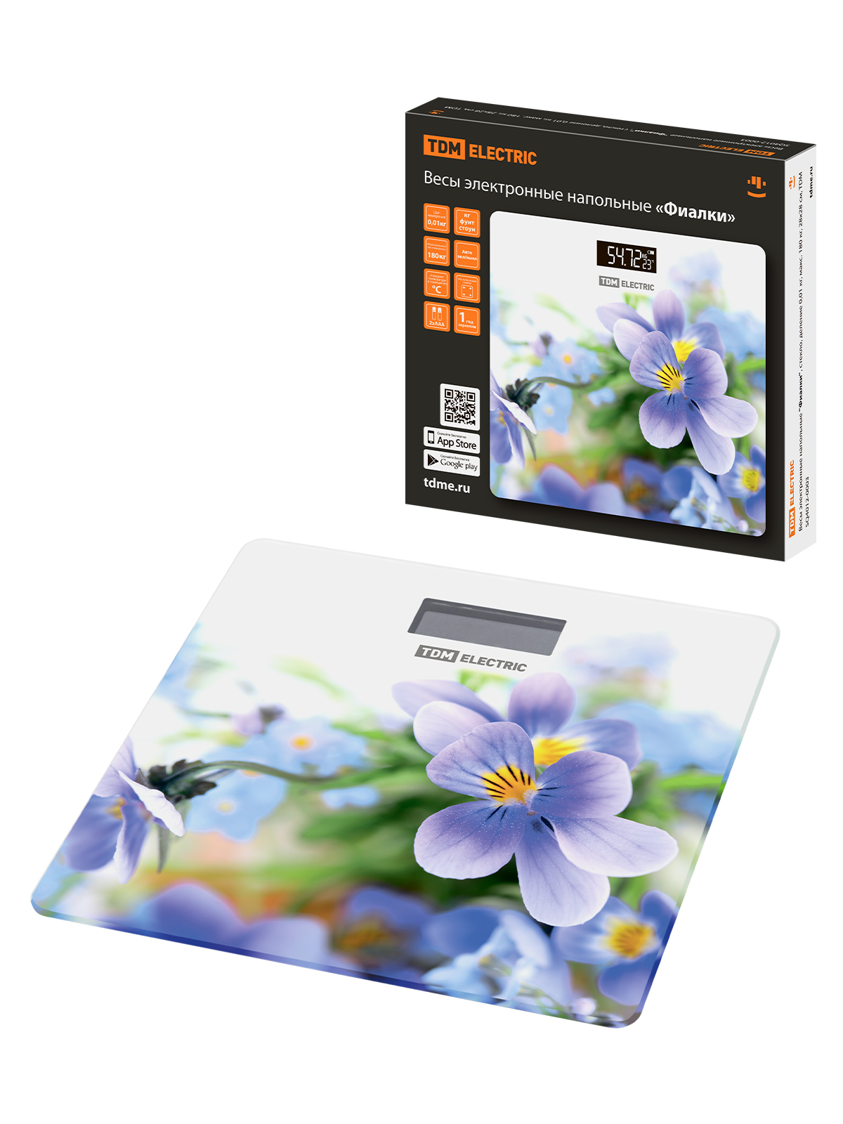 Весы электронные напольные "Фиалки", стекло, деление 0,01 кг, макс. 180 кг, 28х28 см, TDM