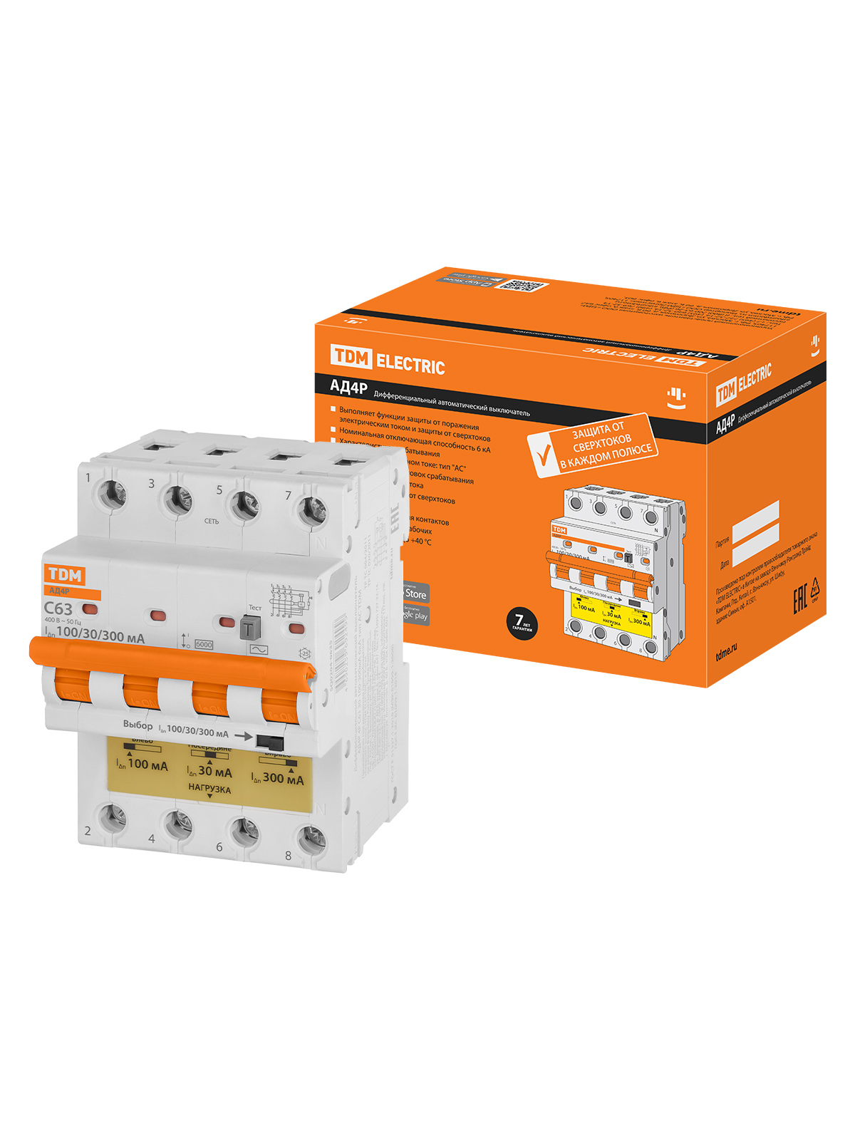 Наименование: Диф.автомат АД4P 4Р С63 30-100-300мА 6кА тип АС TDM