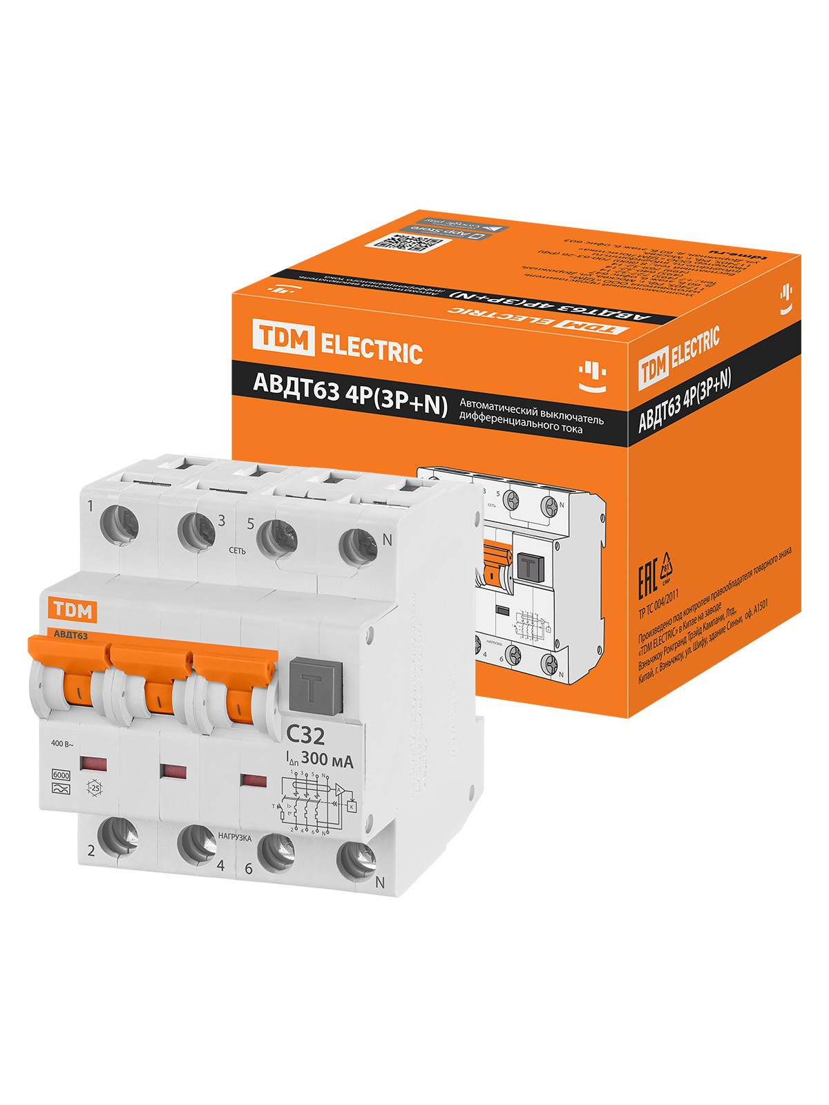 Наименование: АВДТ 63 4P(3Р+N) C32 300мА 6кА тип А TDM
