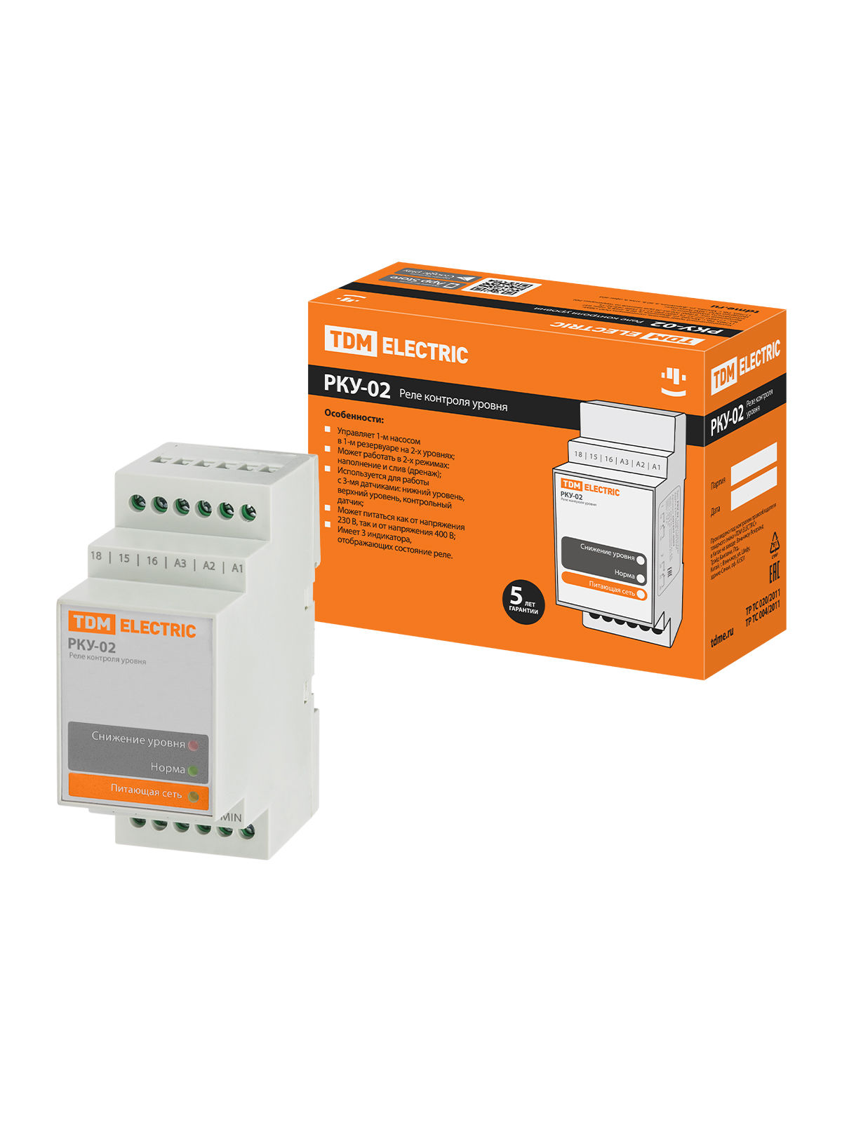 Реле контроля уровня РКУ-02-1нас/1рез/2ур/3датч-230/400В-DIN (без датчиков) TDM
