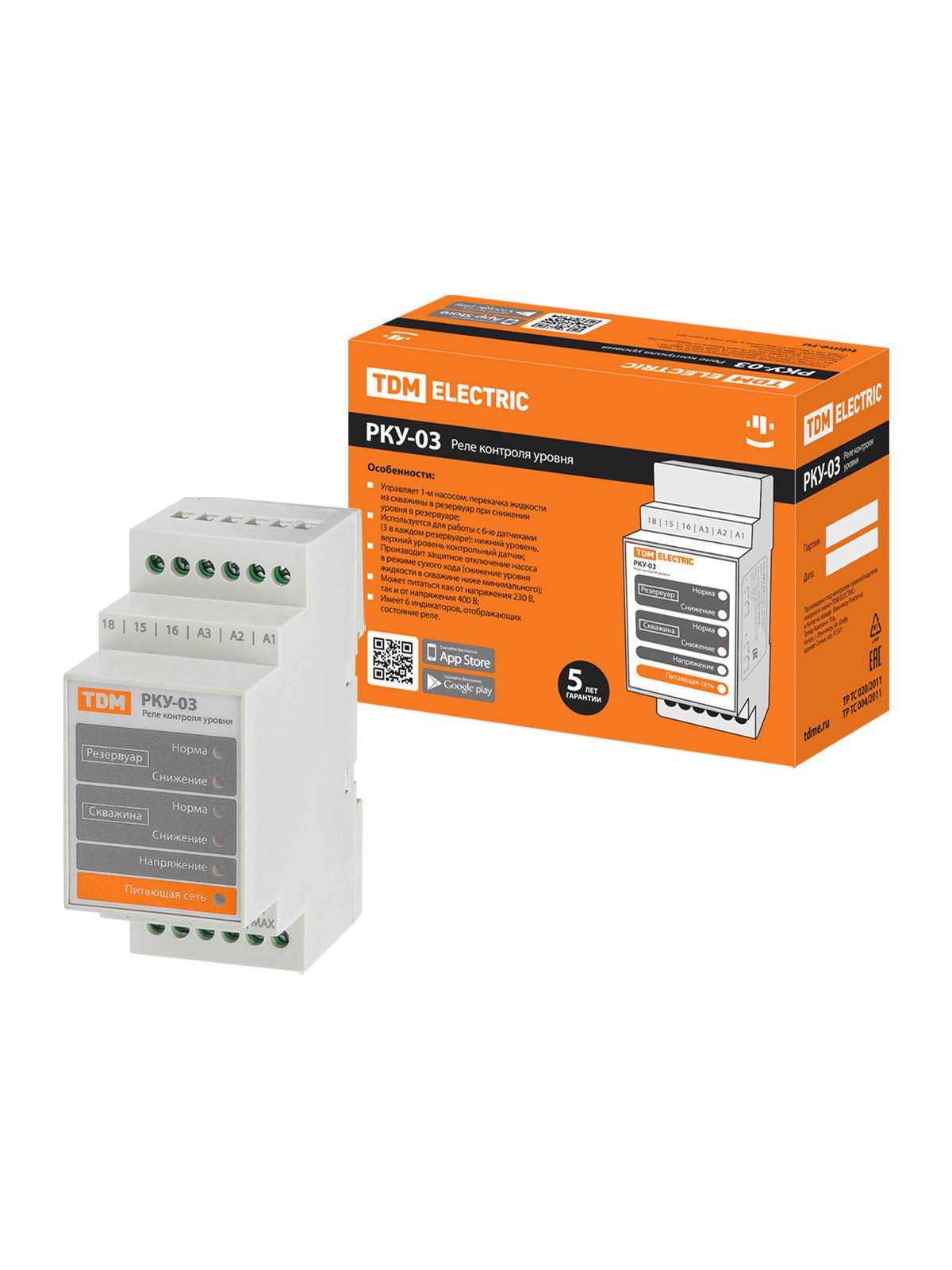 Наименование: Реле контроля уровня РКУ-03-1нас/2рез/4ур/6датч-230/400В-DIN (без датчиков) TDM