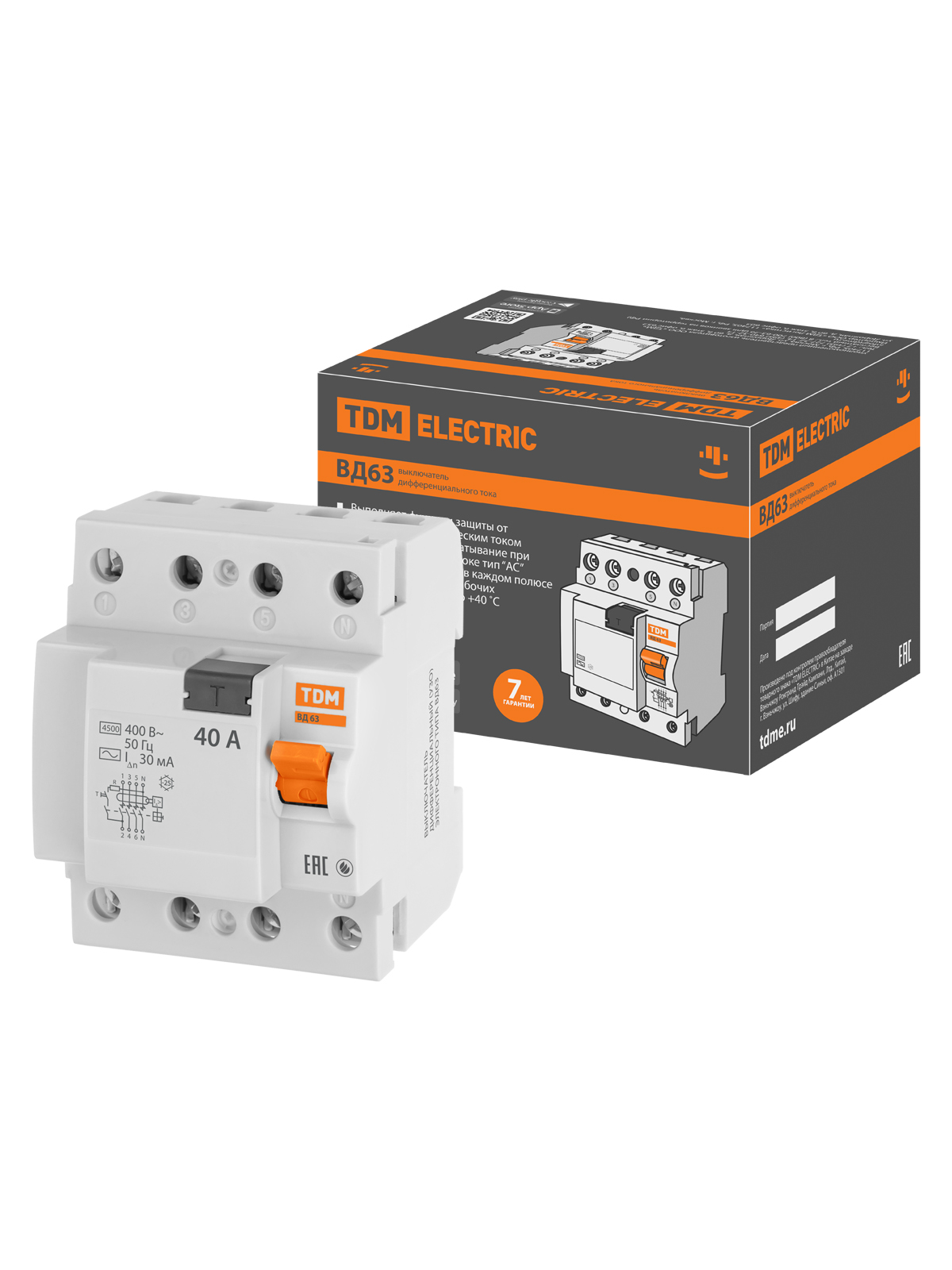 Наименование: УЗО ВД63 4Р 40А 30мА (электронное) TDM