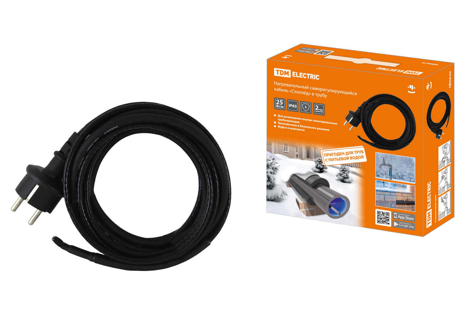 Наименование: Нагревательный саморегулирующийся кабель "Стоплёд" НСК25-В с вилкой, в трубу (25м/250Вт) TDM