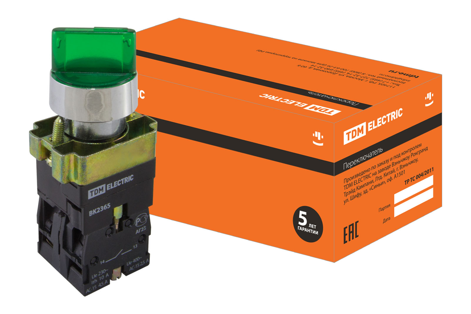 Наименование: Перекл. 2 полож. SB2-BK2365 с фиксацией, 1НО+1НЗ, d22 мм, 230 В LED, зеленый, IP40 TDM