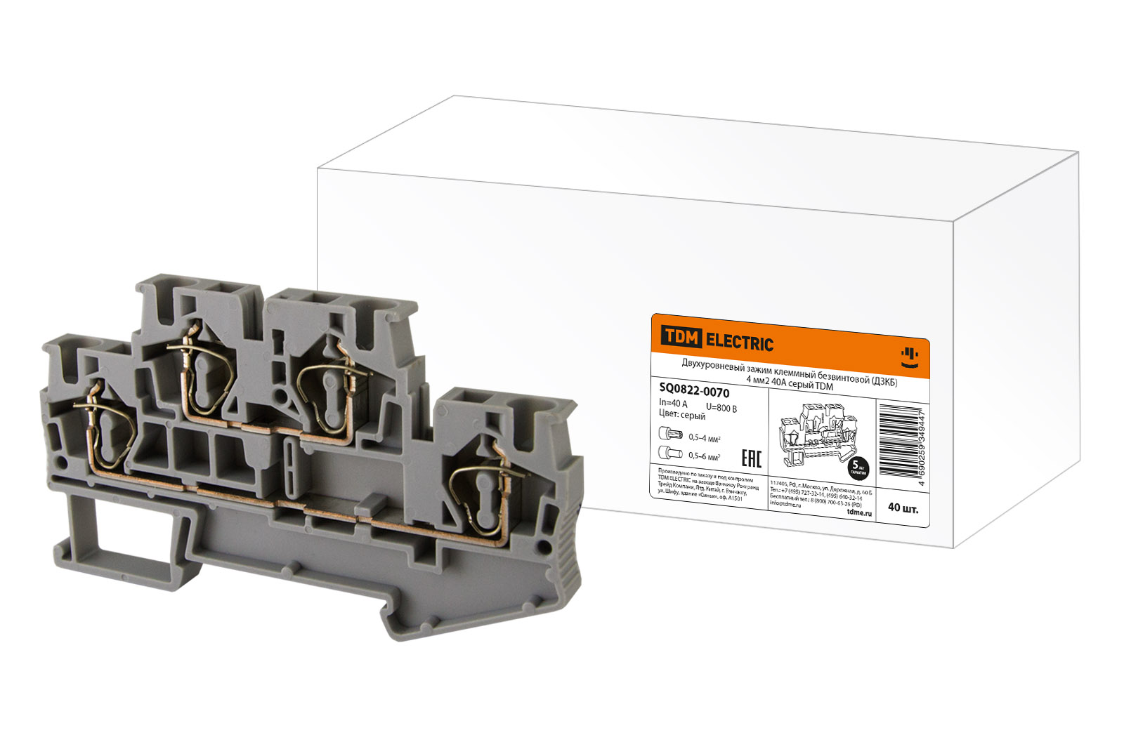Наименование: Двухуровневый зажим клеммный безвинтовой (ДЗКБ) 4 мм2 40А серый TDM