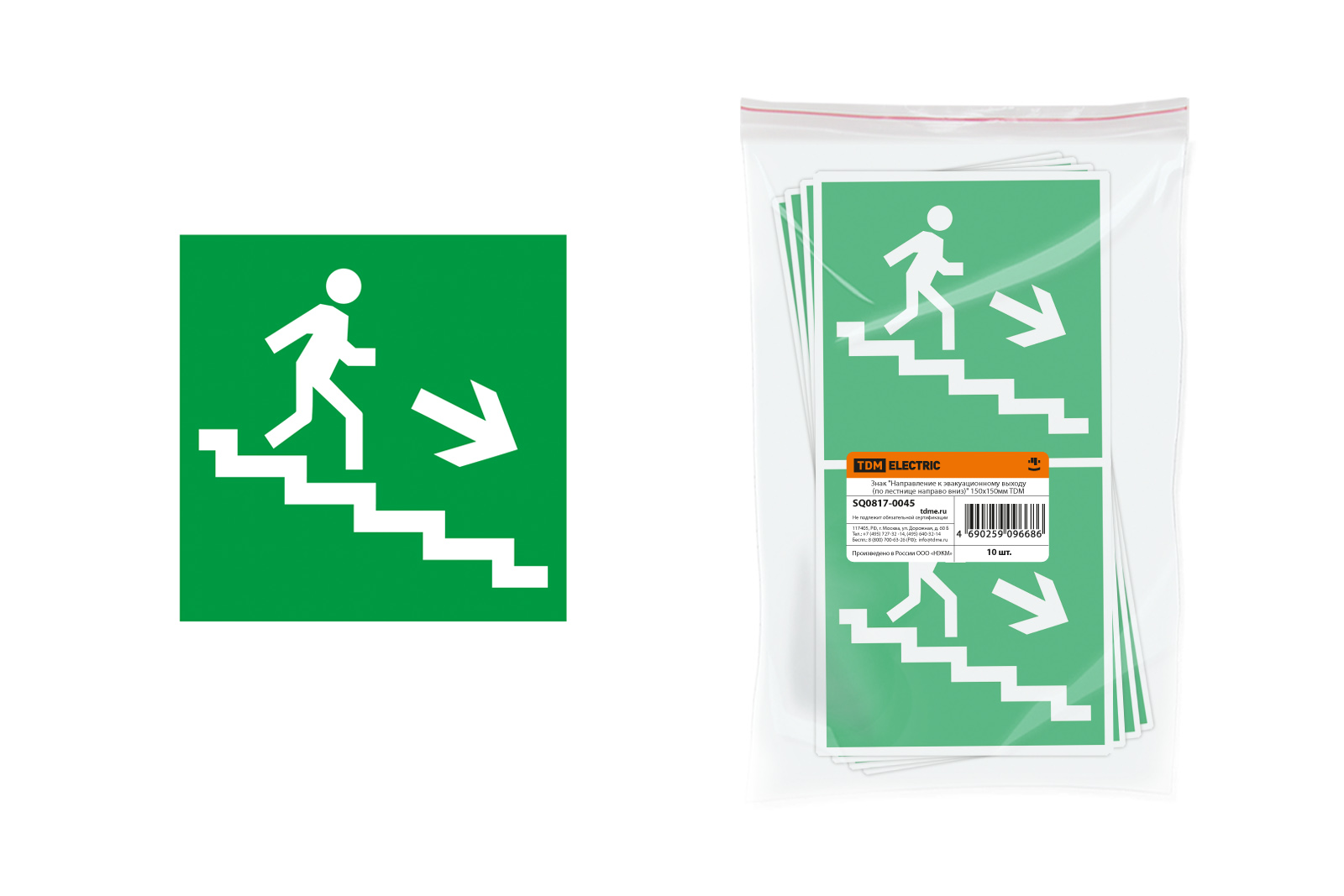 Наименование: Знак "Направление к эвакуационному выходу (по лестнице направо вниз)" 150х150мм TDM